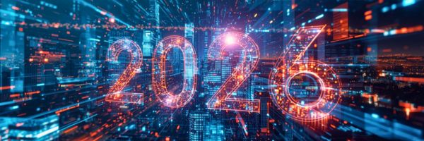 2026 Schriftzug in digitalem Raum voller Daten